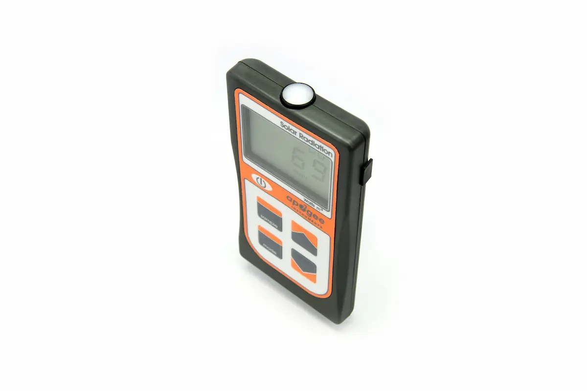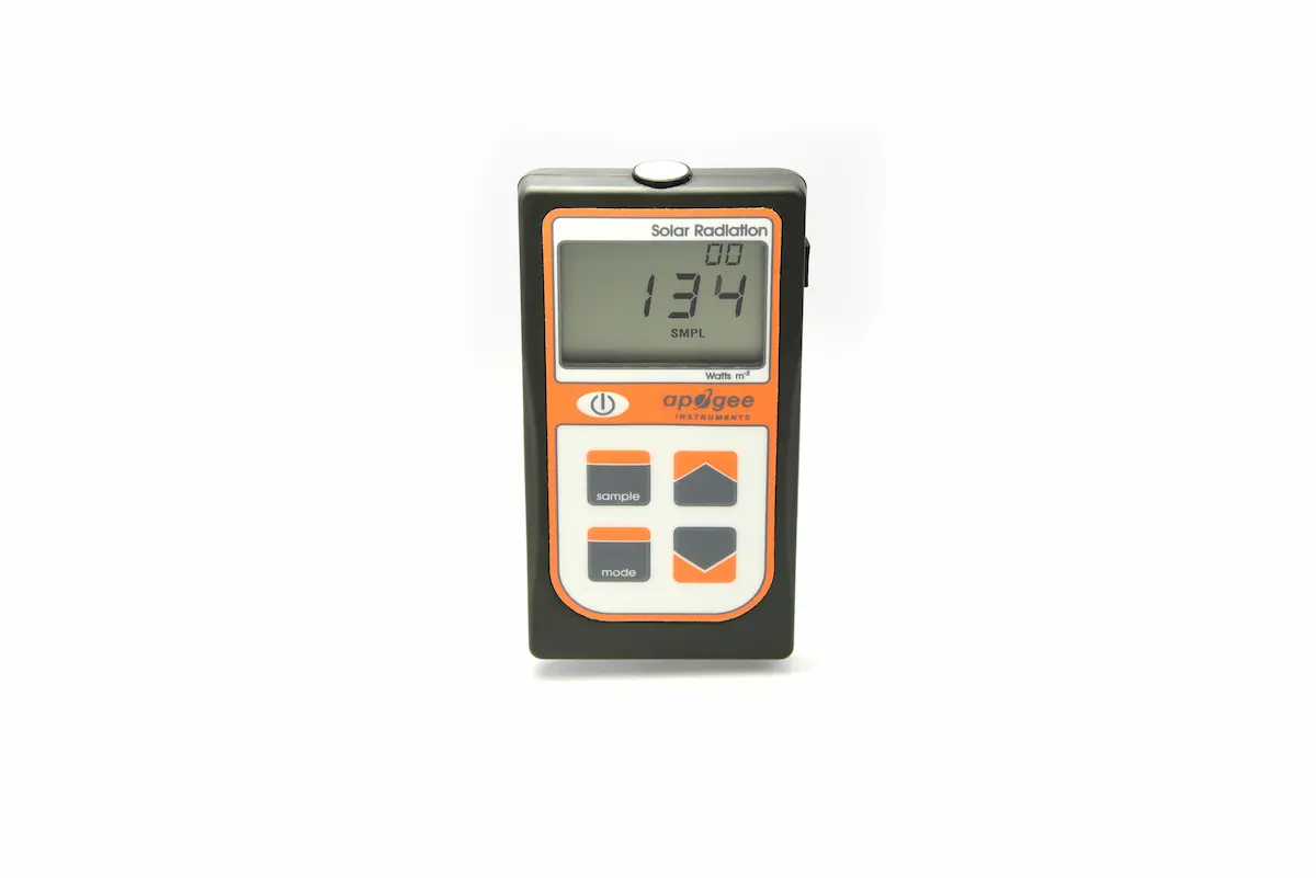 O MP-100 possui um sensor integrado na parte superior do medidor portátil que exibe e armazena medições em W m -2 . Aplicações típicas incluem medição de radiação de ondas curtas em redes meteorológicas agrícolas, ecológicas e hidrológicas e em conjuntos de painéis solares.