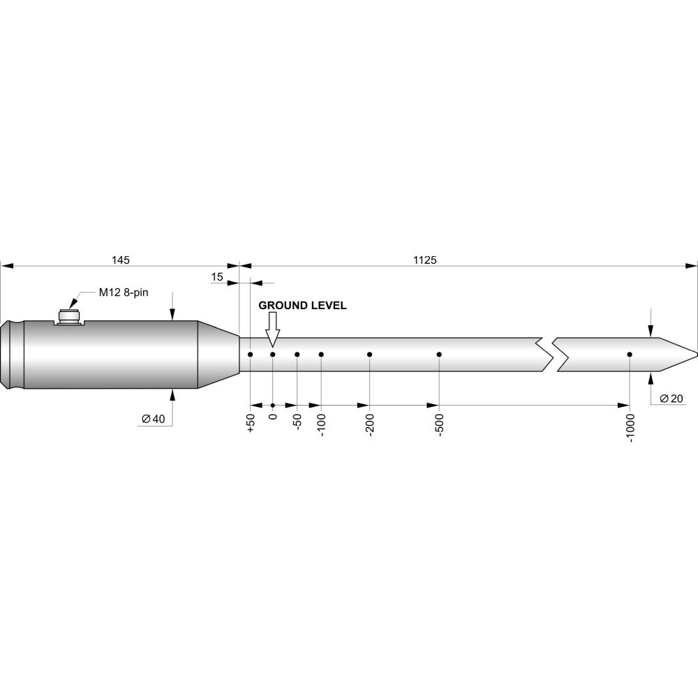 A sonda de temperatura TP32MTT.03.1 é equipada com seis sensores Pt100 1/3 DIN para medir a temperatura nas profundidades de: +5 cm, 0 cm, -5 cm, -10 cm, -20 cm e -50 cm em relação ao nível do solo.